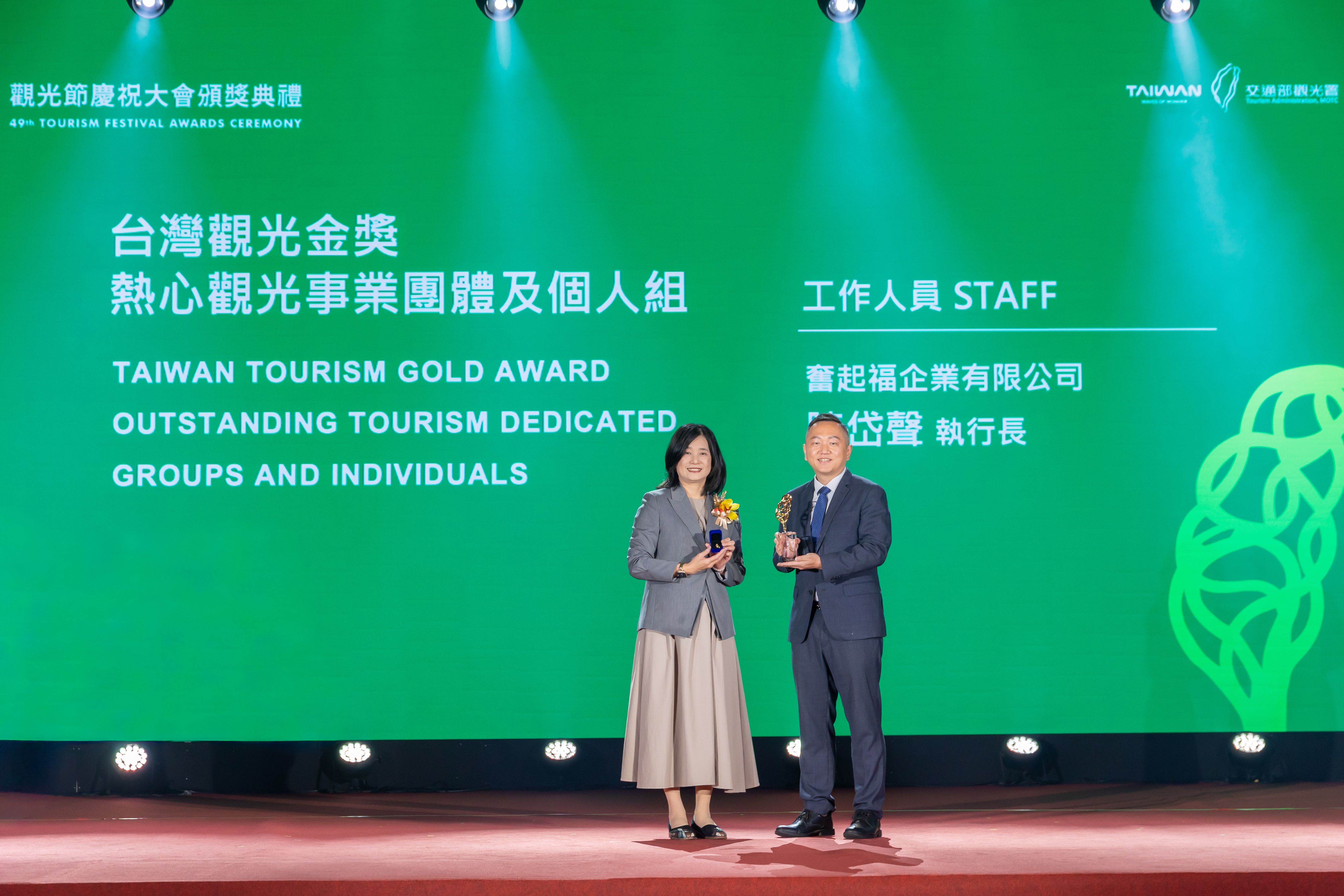 2026年觀光節頒獎典禮上,有「觀光界奧斯卡」之稱的【台灣觀光金獎】正式揭曉。來自嘉義的品牌【奮起福米餅】執行長陳岱聲,因致力推動地方觀光發展,透過結合在地農產、文化故事與觀光體驗,成功將嘉義特色伴手禮推向國際舞台,榮獲本屆台灣觀光金獎「熱心觀光事業個人組」殊榮,並由交通部觀光署陳玉秀署長親自頒獎肯定。