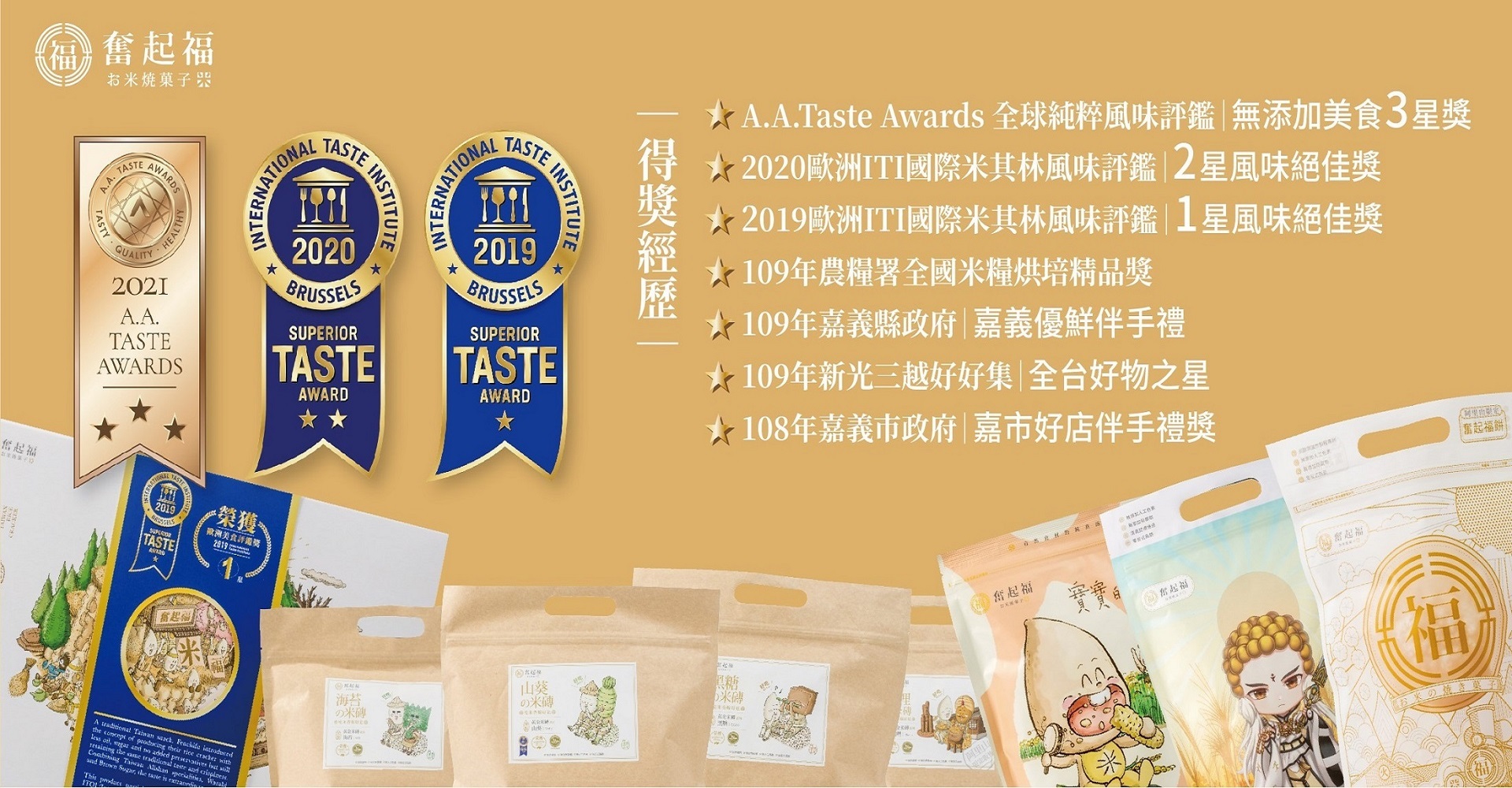 FenchiFu, the first Taiwanese brand to receive international rewards by promoting rice crackers, won the 2018 One-Star Superior Taste Awards, and was granted a Two-Star Reward in 2019 by the Belgium-based International Taste Institute. 2021 The Three-Star award-winner for the A.A. Taste Awards. With its premium quality, FenchiFu was also selected as one of the best souvenirs from Chiayi in 2018, as well as the winner of the 2019 Premium Rice Baked Goods award by the Agriculture and Food Agency.