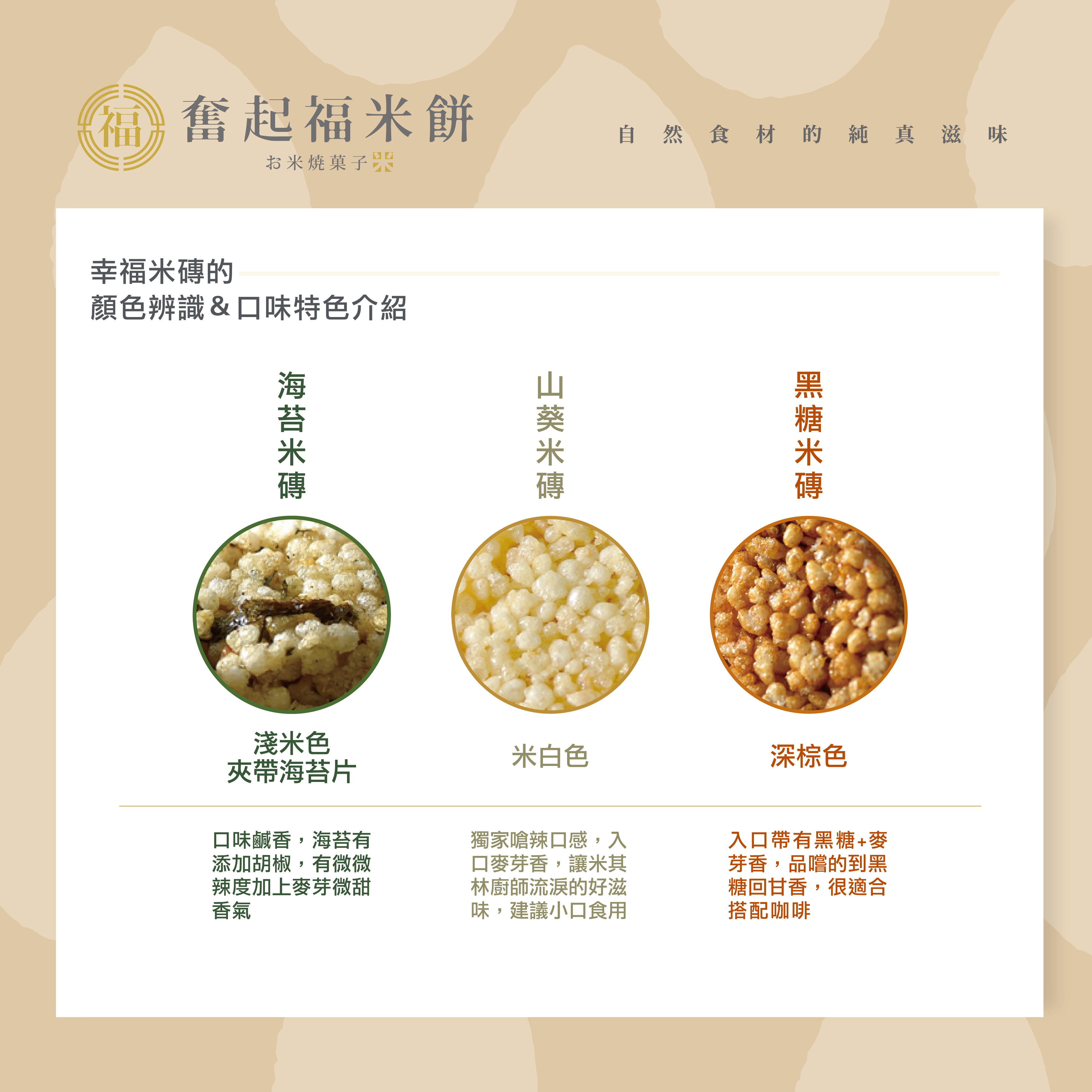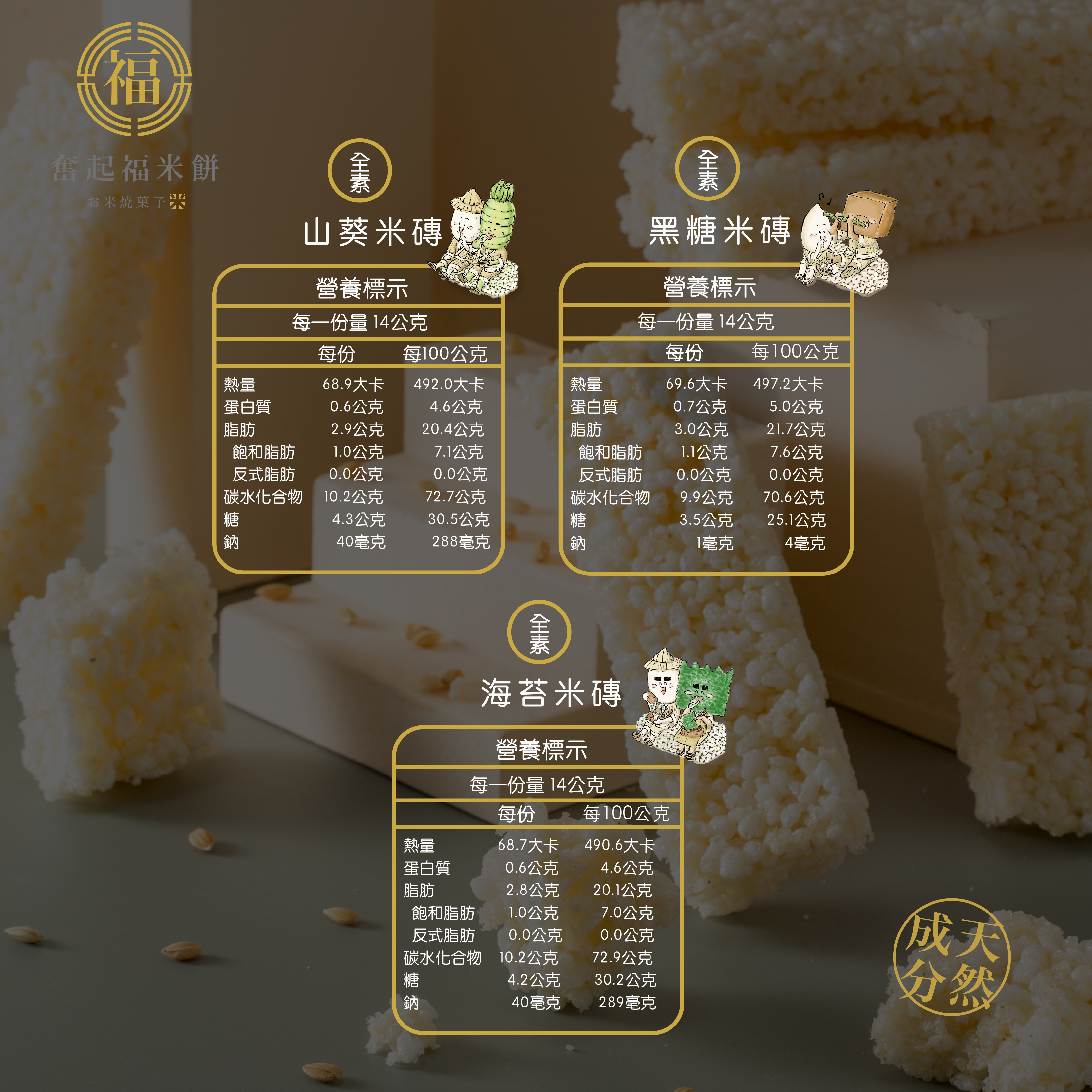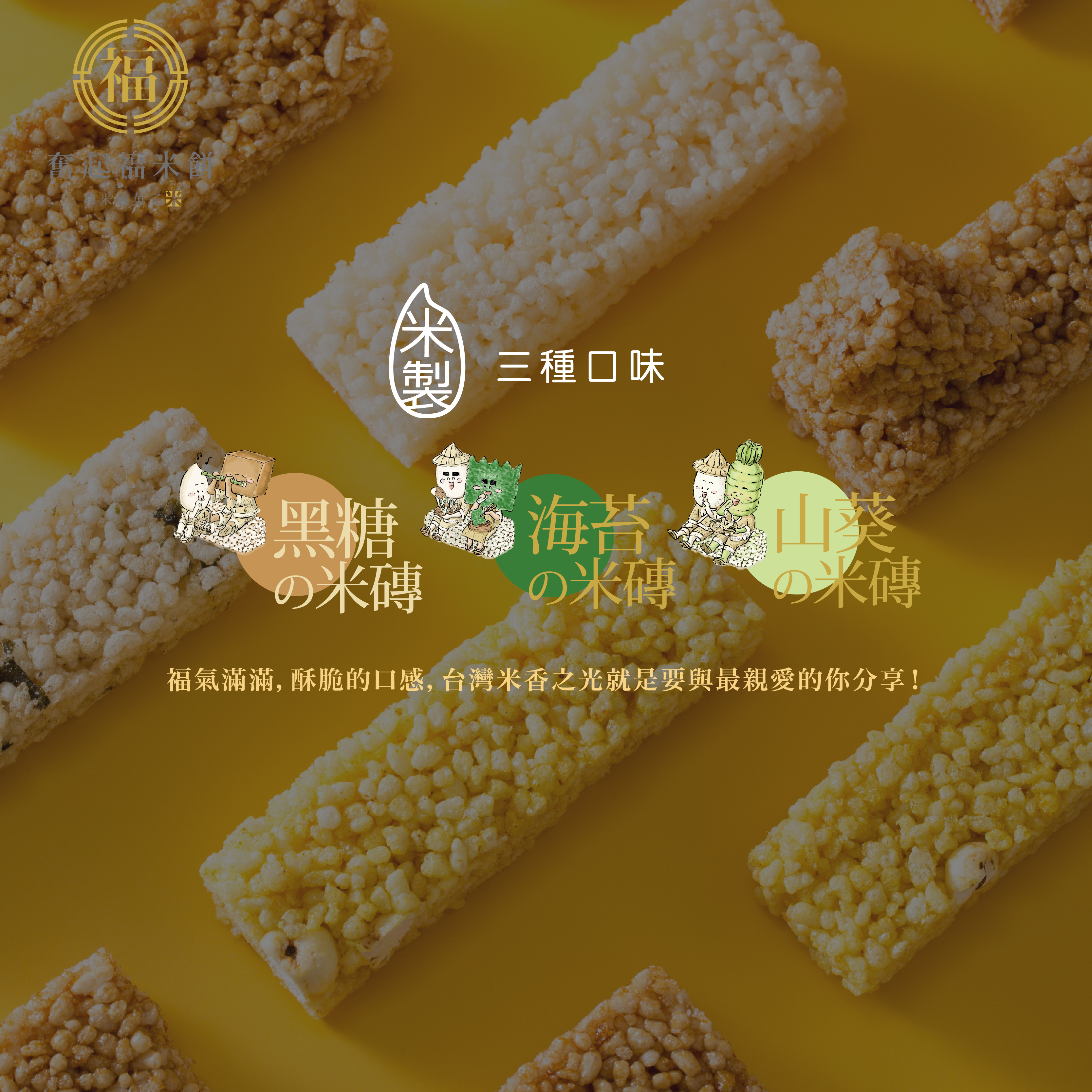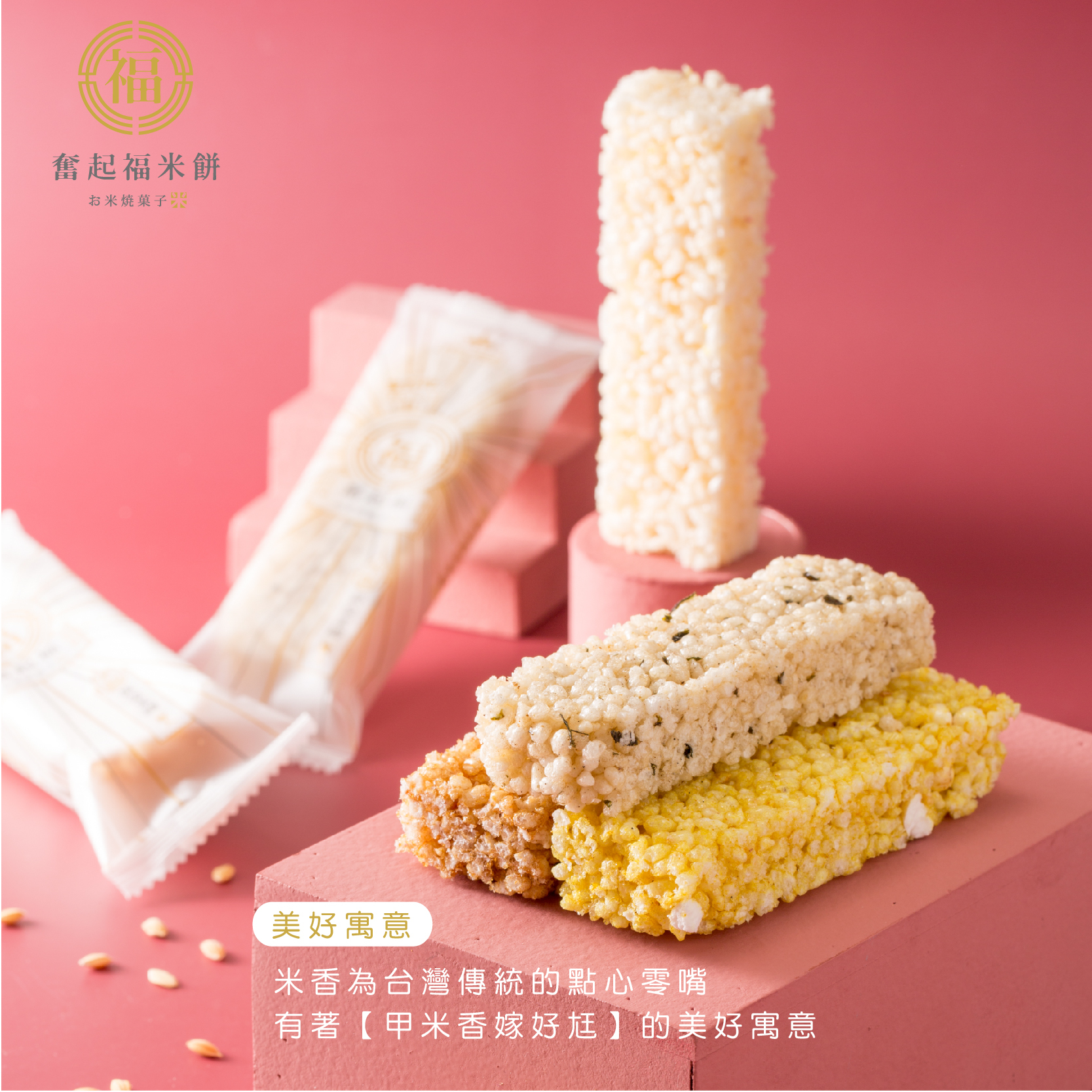 米香為台灣傳統的點心零嘴,並帶有著【甲米香嫁好尪】的美好寓意,奮起福致力於傳統製作方式作研究改良,將米香的製作方式作創新,導入少油低糖無添加的理念,製作出有著有別於傳統米香較蓬鬆的酥脆的口感,並結合在地特色來製作,做出一口咬下會讓人感動的黃金米磚。